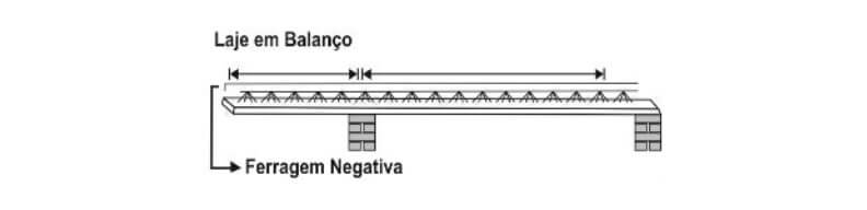 Para combater os momentos fletores negativos, tração superior nos balanços deverá ser utlizada ferragem negativa para os balanços. Assegurar que a ferragem seja bem posicionada, devendo ficar a 1 (um) cm da superficie da capa de concreto. O comprimento do aço deve sr 3 (três) vezes o comprimento do balanço. veja detalhamento ao lado e consultar detalhamento